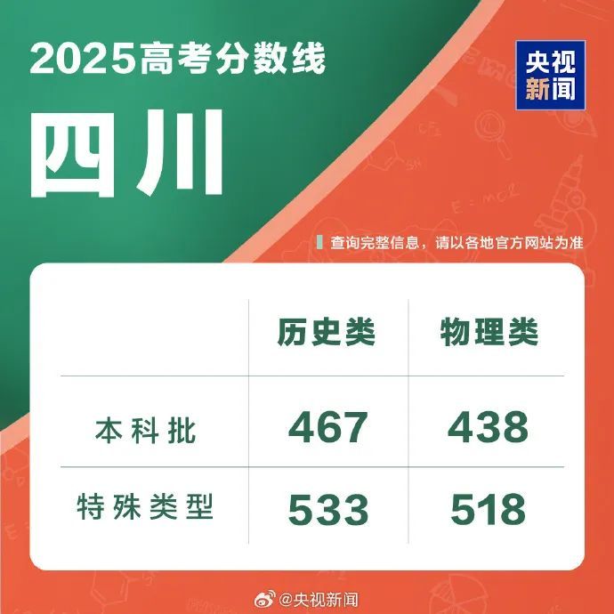 四川省2025年高考分数线公布:①本科批次历史类467分,物理类438分;②特殊类型历史类533分,物理类518分。