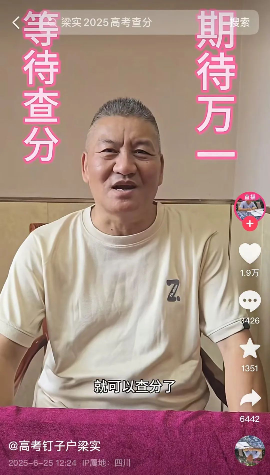 6月25日,第29次参加高考的梁实@梁三百300 发视频称,今天下午6点左右就可以查分了,有点坐立不安。梁实称,一觉醒来恐慌感就来了,“等待惊喜和意外出现”。