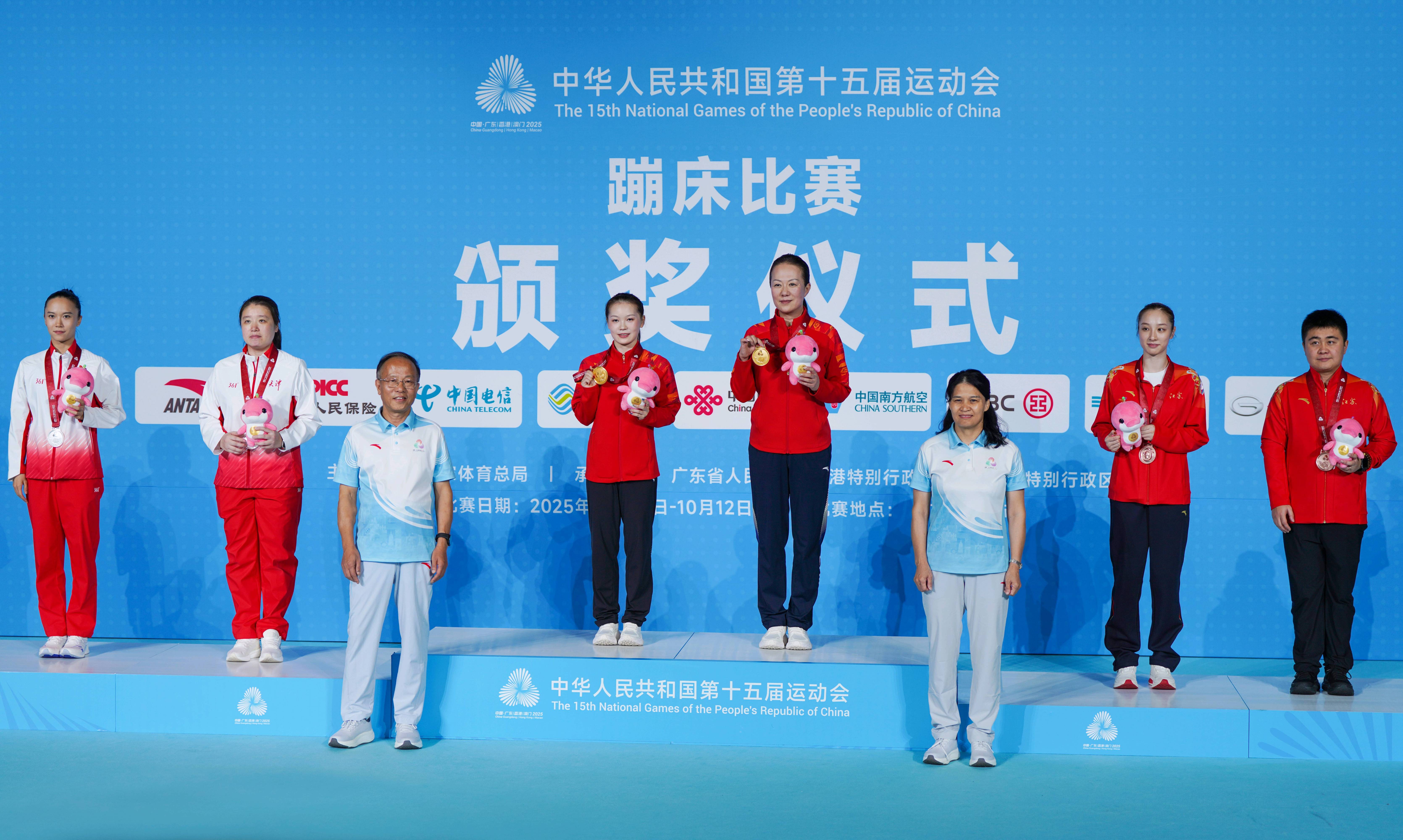 蹦床个人决赛获奖选手上台领奖。