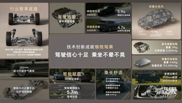动力方面,该车配备蔚来ET9同款的永磁同步后电机,峰值功率340千瓦,体积仅37升,体积功率密度9.2kW/L,行业领先。