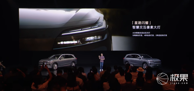车头大灯被称为“星路闪耀”智慧交互像素大灯,支持多种静态和动态灯语,并具备ADB自适应功能,如自适应远光、动态弯道照明等,极大地提升了行车安全性和趣味性。