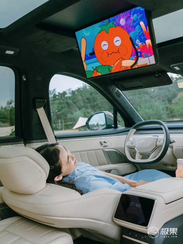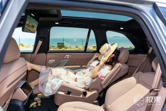 后排也有车机屏同款17.3英寸3K可翻折娱乐屏、中通道后方有一块屏幕,可以操控车辆的空调、饮料和座椅,后排用户体验直逼超豪华车型。