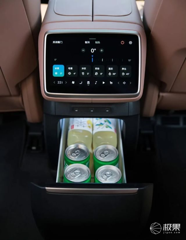 车内有冷暖冰箱,最大容量8.8升,箱门也是电动开合。
