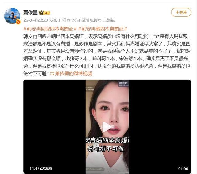 面对网友“是不是没离婚”、“全是炒作”的连环质疑,韩安冉这次选择了“证件说话”。她逐一展示并解释:与“小猪哥”两本,与“前科哥”一本,与现任前夫宋浩然一本,四本证齐全,强调“离婚证早就拿了”。她坚决否认炒作,坚称“我跟每个人不好就是真的不好了”,将自己的多次婚姻终结归结为简单的“感情破裂,过不下去”。